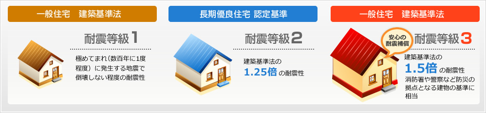 長期優良住宅認定制度の項目の中で、特に技術的に難しいとされる“耐震性”では、「耐震等級3」を自社の設定条件とし、全棟で「耐震等級3」を実現します。